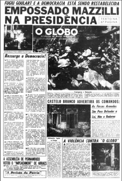 Leia a seguir, na íntegra, o posicionamento histórico e irreparável do jornal da família Marinho durante o processo que removeu, à força, um governo democraticamente eleito e instaurou uma ditadura militar no Brasil. Na foto abaixo, a capa do jornal O Globo, celebrando o “ressurgimento da democracia”, um dia após o Golpe Militar.